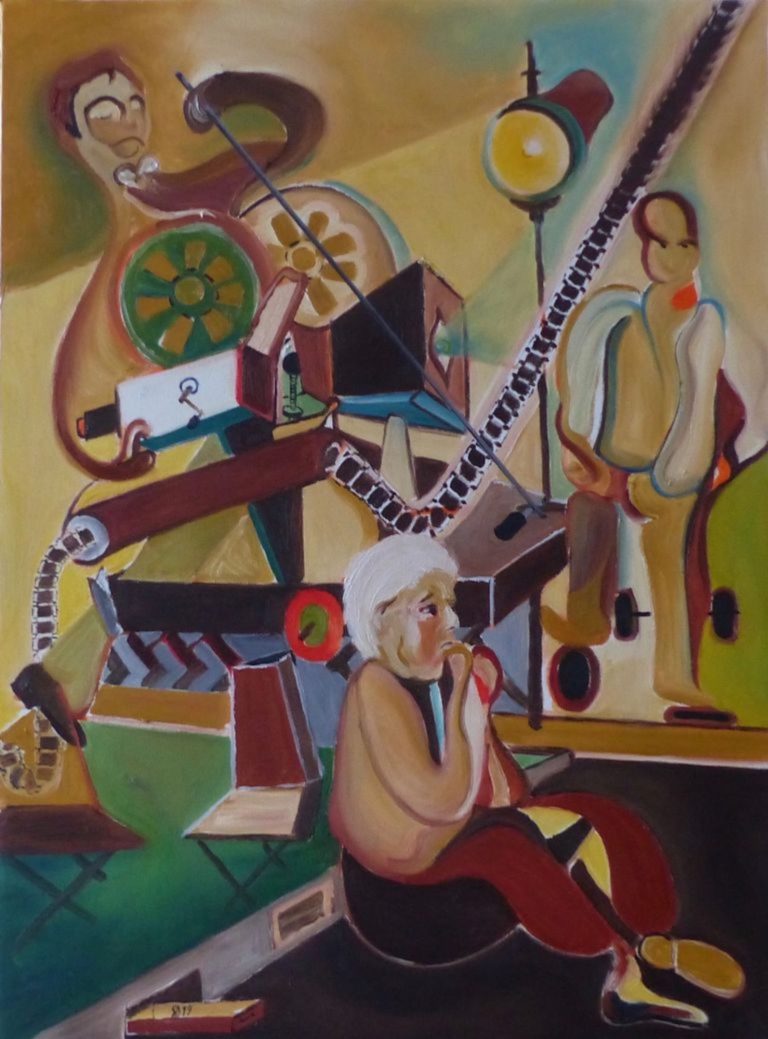 Un personnage assis au premier plan semble absorbé par ses pensées, le visage appuyé sur sa main. Autour de lui, un décor complexe où se mêlent instruments de musique, projecteurs et éléments mécaniques, suggère l’attente d’une représentation. Les formes étirées, presque organiques, dialoguent avec la rigidité des structures techniques, créant une tension visuelle.