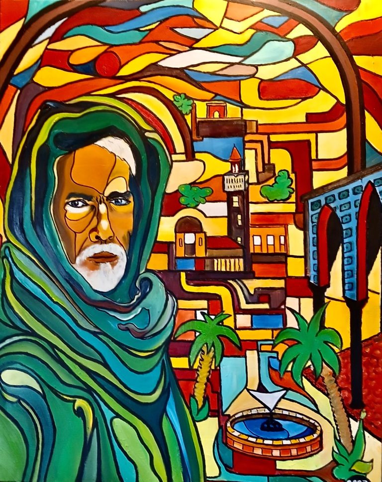 Un homme drapé de verts profonds se tient au premier plan, son visage buriné éclairé par une lumière dorée qui semble venir de loin. Son regard, intense et presque immobile, traverse un décor éclaté de formes et de couleurs : palais ocre, minarets élancés, palmiers vibrants, arcades bleues, fontaines circulaires. Tout autour de lui, la ville se déploie comme un vitrail solaire, faite de parcelles de mémoire, de chaleur et de poussière lumineuse. Le ciel, en volutes rouges et jaunes, semble respirer au rythme de cette terre du Sud, mouvante et ardente.