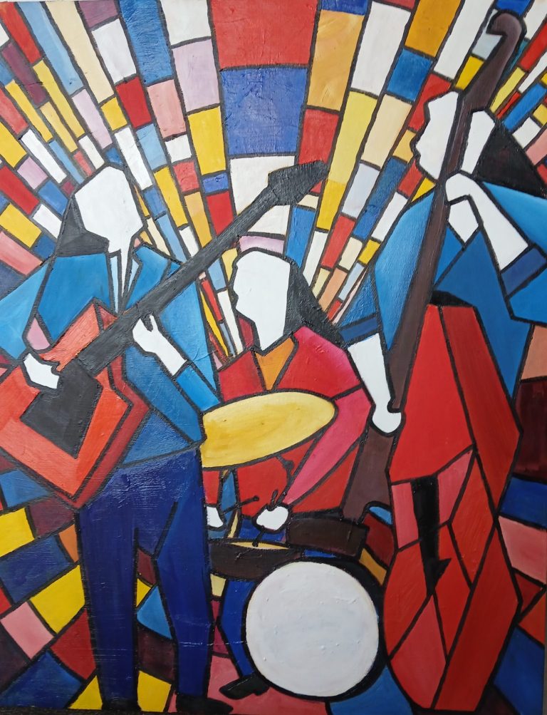 Cette composition rassemble trois musiciens dans un espace vibrant d’énergie, où les formes géométriques et les couleurs primaires rythment la toile comme une partition visuelle. Les instruments — trompette, saxophone, contrebasse — surgissent en éclats de lignes brisées et de volumes dynamiques. Le rouge, le jaune et le bleu dominent, créant une ambiance chaleureuse, presque incandescente, à l’image des improvisations du jazz et du blues.