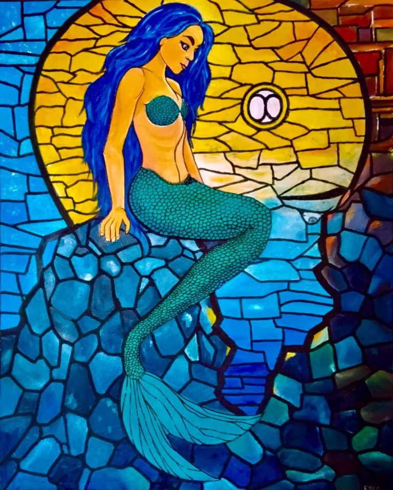 Assise sur un rocher aux teintes d’azur, la sirène aux longs cheveux bleus semble perdue dans une rêverie profonde. Autour d’elle, les pierres et la mer se fondent dans un même éclat de mosaïque, où chaque fragment de couleur capte la lumière comme un éclat de pensée. Le grand disque doré derrière elle évoque à la fois le soleil et un vitrail sacré, illuminant sa silhouette d’une aura mystique. Son regard penché, intérieur, la relie à quelque chose d’invisible, un murmure ancien venu des profondeurs.