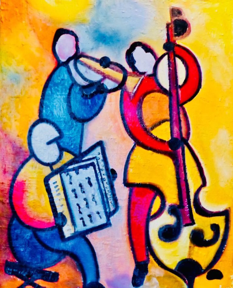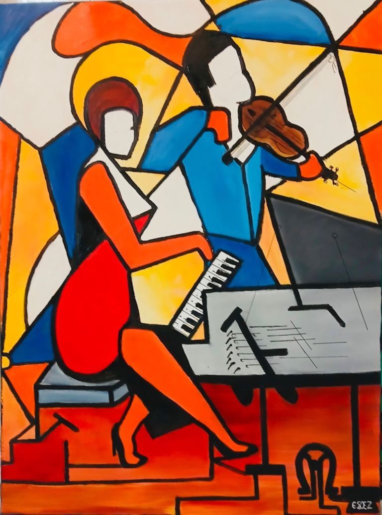Deux personnages, musiciens complices, occupent le centre de la toile. Leurs corps stylisés, aux couleurs vives et contrastées, semblent entrer en vibration avec les lignes brisées qui les entourent. Les instruments, à la frontière de l’abstraction, prolongent leurs gestes, et l’ensemble respire un rythme commun, presque palpable. La peinture, par son dynamisme chromatique, évoque moins une scène figée qu’une pulsation musicale.