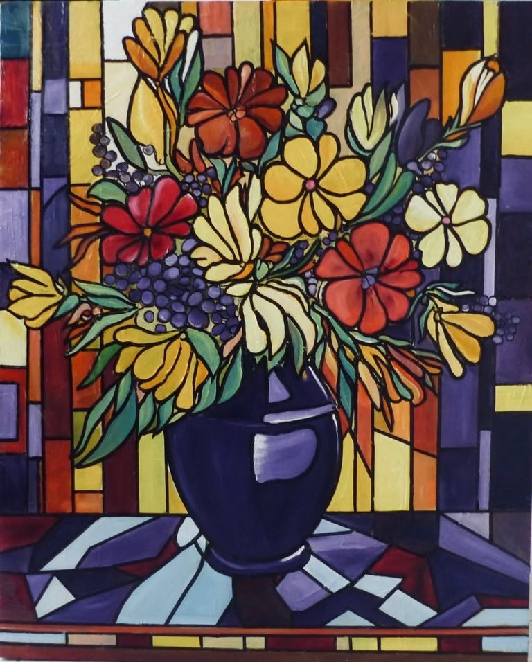 La toile s’organise en fragments lumineux qui rappellent les éclats d’un vitrail ancien. Les formes florales, stylisées et rythmées, semblent s’épanouir derrière une trame colorée où dominent les rouges, les verts et les ors. L’ensemble dégage une impression d’équilibre fragile, comme si la nature s’était figée dans la transparence du verre.