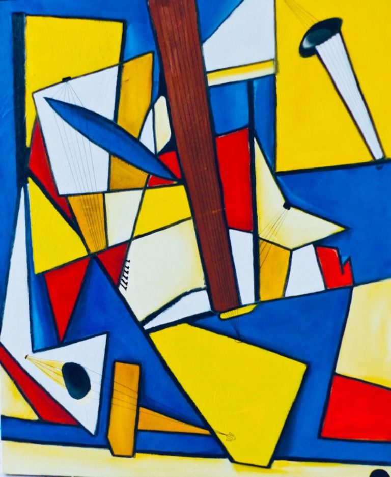 Sur la toile éclatent des guitares éclatées, démultipliées, déconstruites en fragments colorés. Les lignes se tordent, se brisent, se recomposent en une architecture sonore où l’instrument devient presque corps. Chaque fragment semble vibrer d’une musique intérieure.